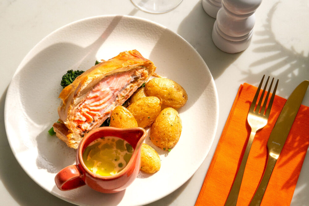 Our Sunday Roast menu is perfect for families and friends seeking a relaxed dining experience. Savour traditional dishes like Overnight Roasted Beef and Half Roast Chicken with all the trimmings, alongside a selection of mains from our A La Carte, such as the classic Atlantic Fish and Chips or freshly baked Salmon en Croûte.